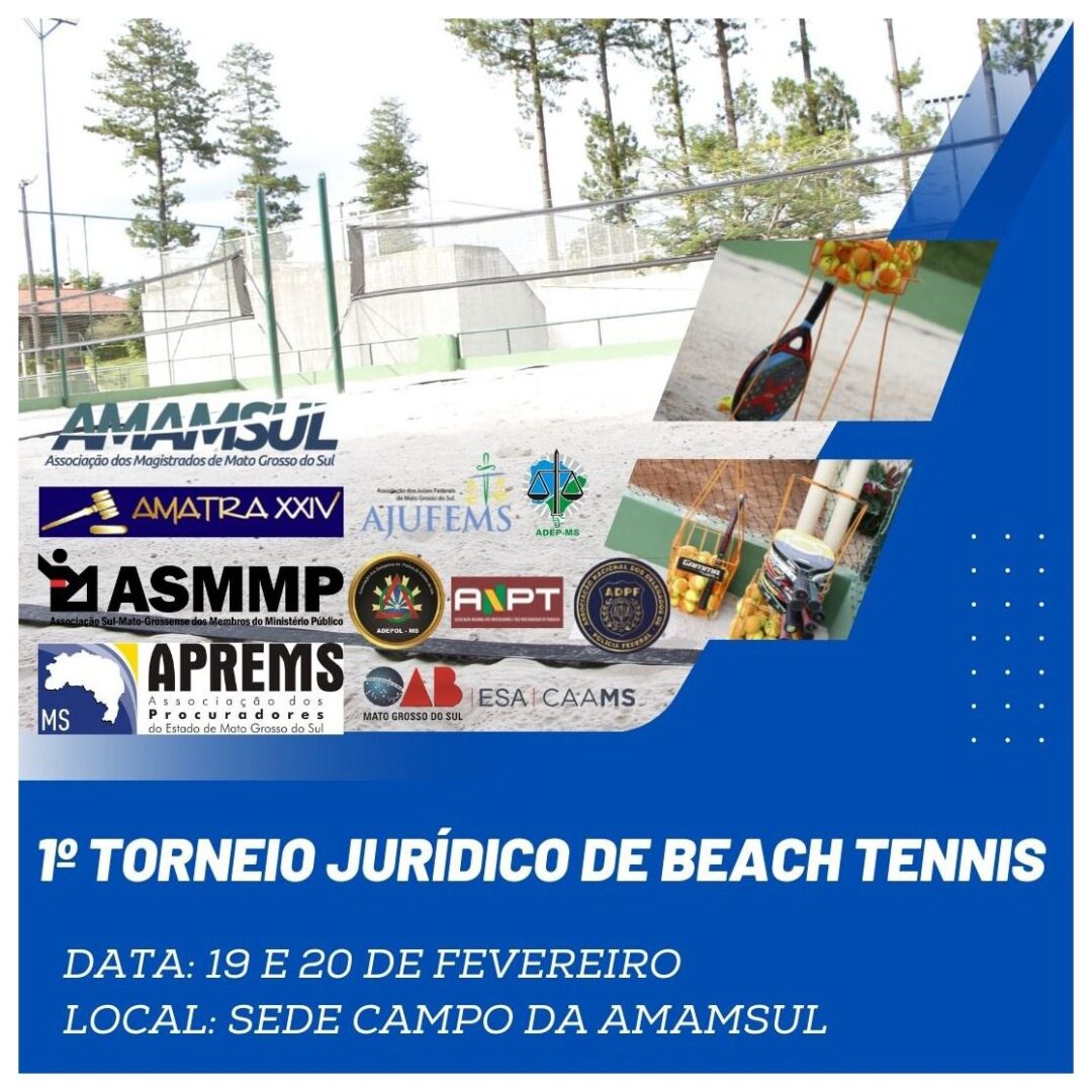 A Adepol-MS, por meio da Diretoria de Esportes, realiza nos dias 19 e 20 de fevereiro (nova data) o 1º Torneio Jurídico de Beach Tennis, que será realizado na sede campo da AMAMSUL, em Campo Grande. O evento tem o apoio da AMAMSUL, ASMMP, ADEP-MS, APREMS, AMATRA, AJUFEMS, ADPF, ANPT e OAB-MS.