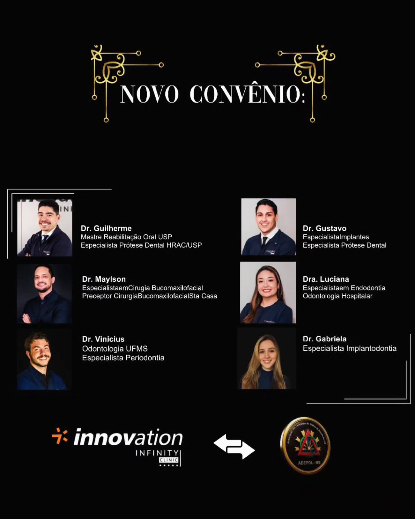 A Associação dos Delegados de Polícia de Mato Grosso do Sul (Adepol-MS) firmou convênio com a Innovation Infinity Clinic, referência em odontologia moderna, especializada em implantes, próteses, reabilitação oral, endodontia e estética dental.
