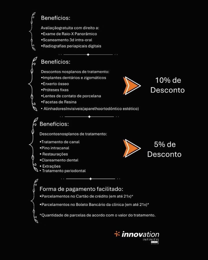 ➡️ Descontos especiais em implantes, próteses, lentes de porcelana, clareamento, alinhadores invisíveis e muito mais.