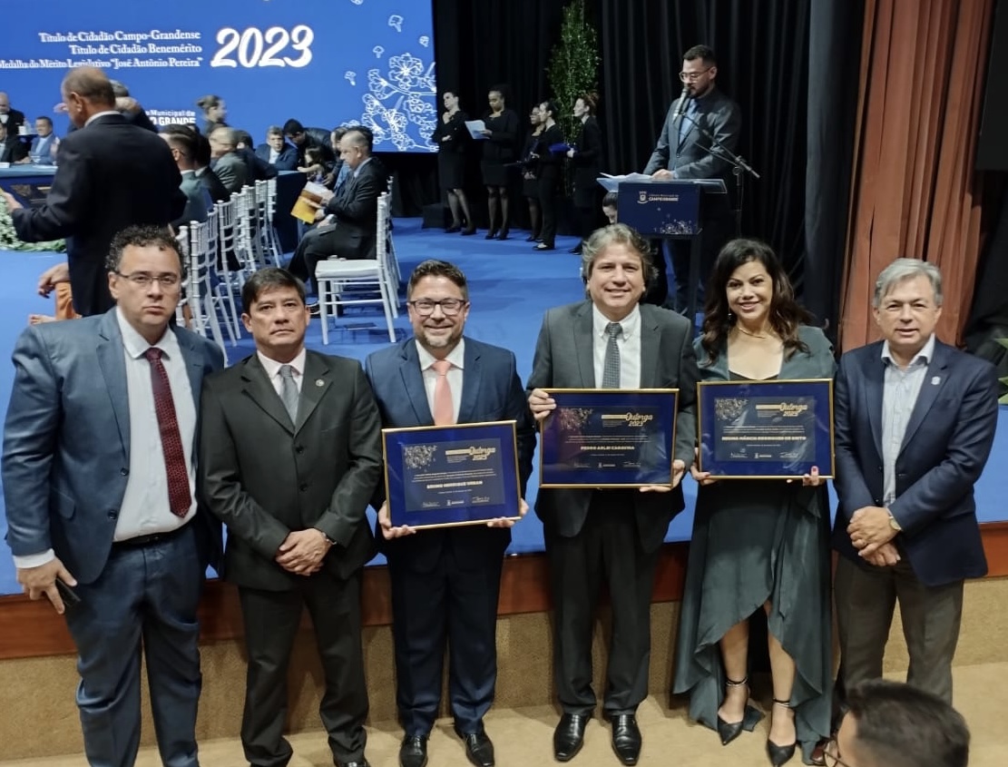 O presidente da Adepol-MS, Delegado André Matsushita Gonçalves, prestigiou na noite desta quinta-feira (24) a cerimônia de entrega de Título de Cidadão Campo-Grandense a quatro delegados associados, Bruno Henrique Urban, Carlos Delano Gehring Leandro de Souza, Regina Márcia Rodrigues de Brito e Pedro Arlei Caravina, pela Câmara Municipal de Campo Grande.