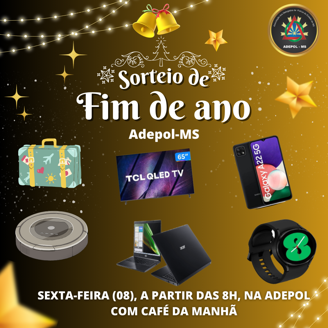 Será realizado na sexta-feira (08/12), a partir das 08h, o café da manhã oferecido aos associados para a realização do sorteio de prêmios de fim de ano da Adepol-MS, na sede da entidade. O sorteio tem início às 09h e poderá ser acompanhado também pela internet, com transmissão ao vivo pelo Youtube da Adepol (@adepolms1).