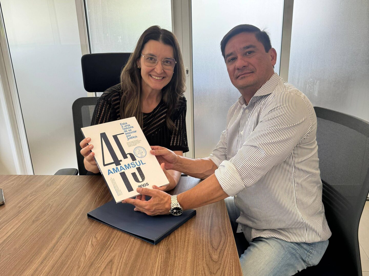 O Presidente da Adepol-MS, Delegado André Matsushita visitou na manhã de hoje as novas instalações da Associação dos Magistrados de MS, ocasião em que conheceu a nova sede, inaugurada recentemente. Foi recebido pela Presidente, Juíza Mariel Cavalin dos Santos, que presenteou o visitante com um exemplar do livro “Amamsul 45 Anos”, obra que ilustra toda a trajetória da associação e da magistratura Sul Mato-Grossense, desde os primórdios de sua existência até a atualidade.