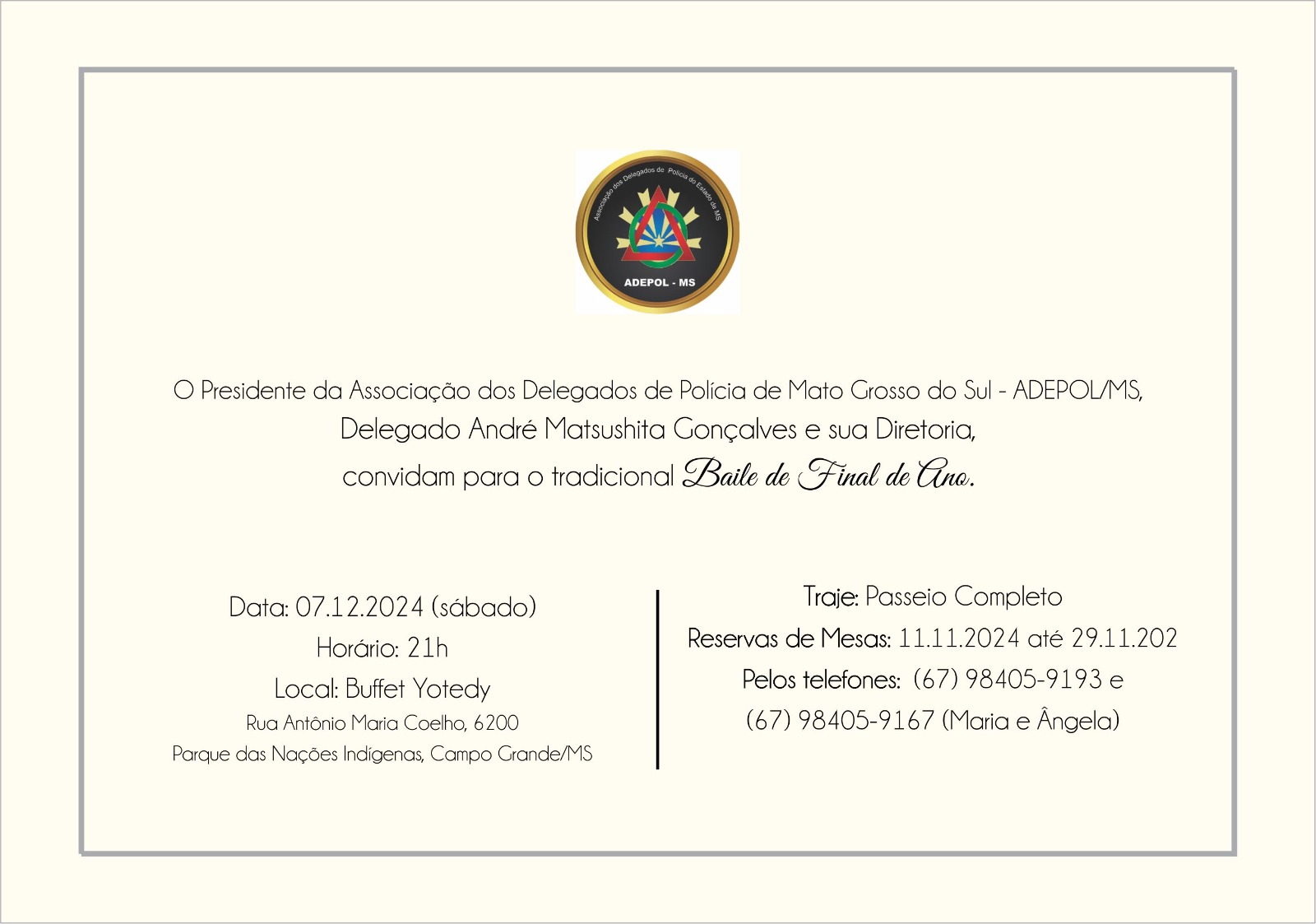Prezados associados, em breve realizaremos a abertura das mesas para o nosso tradicional Baile de Final do Ano da ADEPOL, que ocorrerá dia 07/12/2024 (sábado) a partir das 21h00min no Buffet Yotedy.