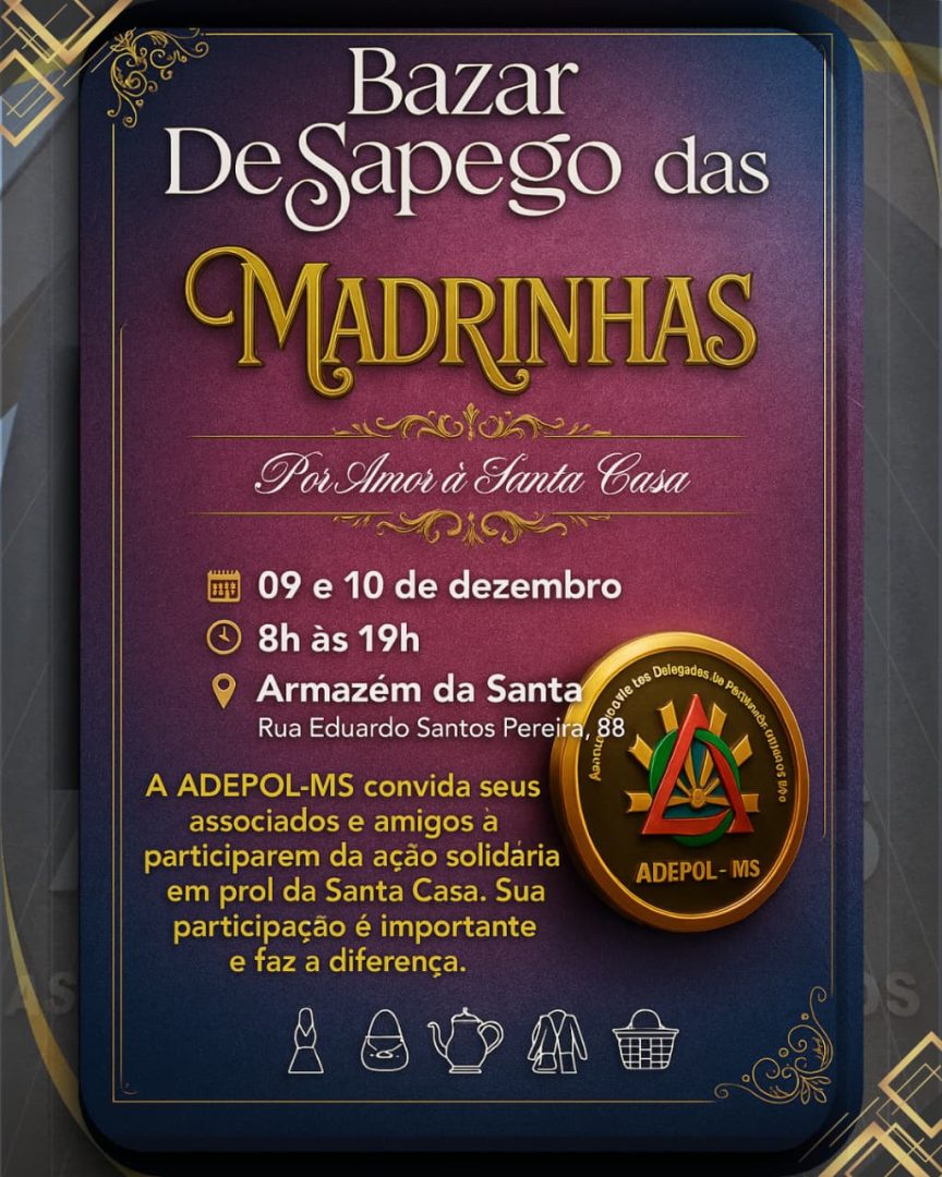 A Associação dos Delegados de Polícia do Estado de Mato Grosso do Sul (ADEPOL-MS) convida todos os associados a se unirem em mais uma corrente do bem, participando do Bazar Desapego das Madrinhas – Por Amor à Santa Casa, que será realizado nos dias 9 e 10 de dezembro, das 8h às 19h, no Armazém da Santa Casa (Rua Eduardo Santos Pereira, 88).