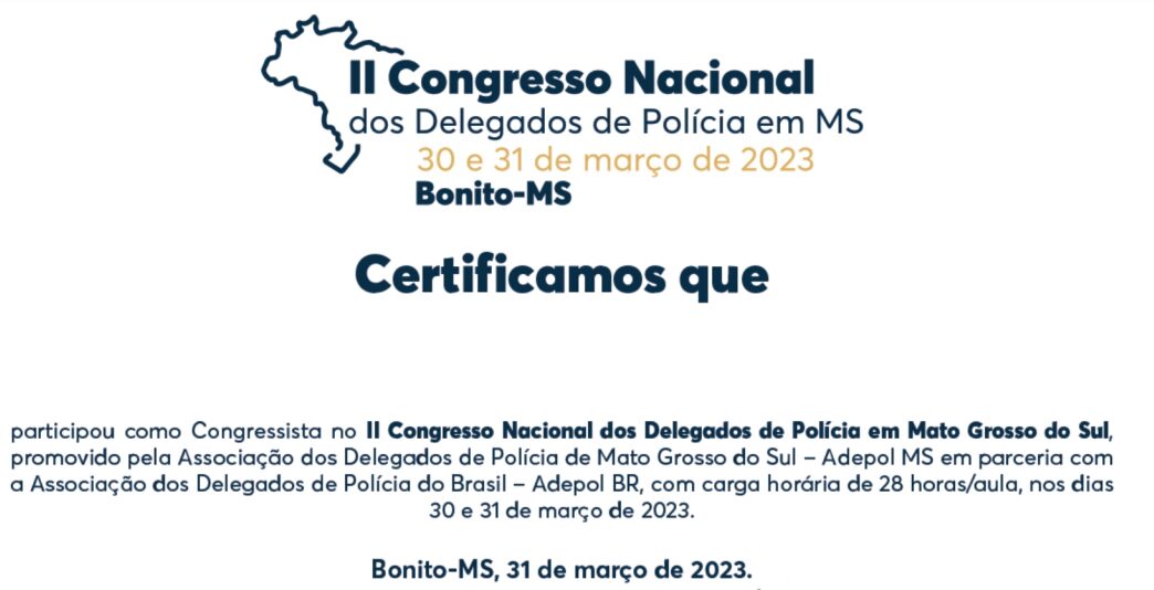 Os participantes do II Congresso Nacional dos Delegados de Polícia em MS, realizado nos dias 30 e 31 de março, em Bonito (MS), já podem emitir seus certificados de participação, com carga horária de 28 horas/aula.