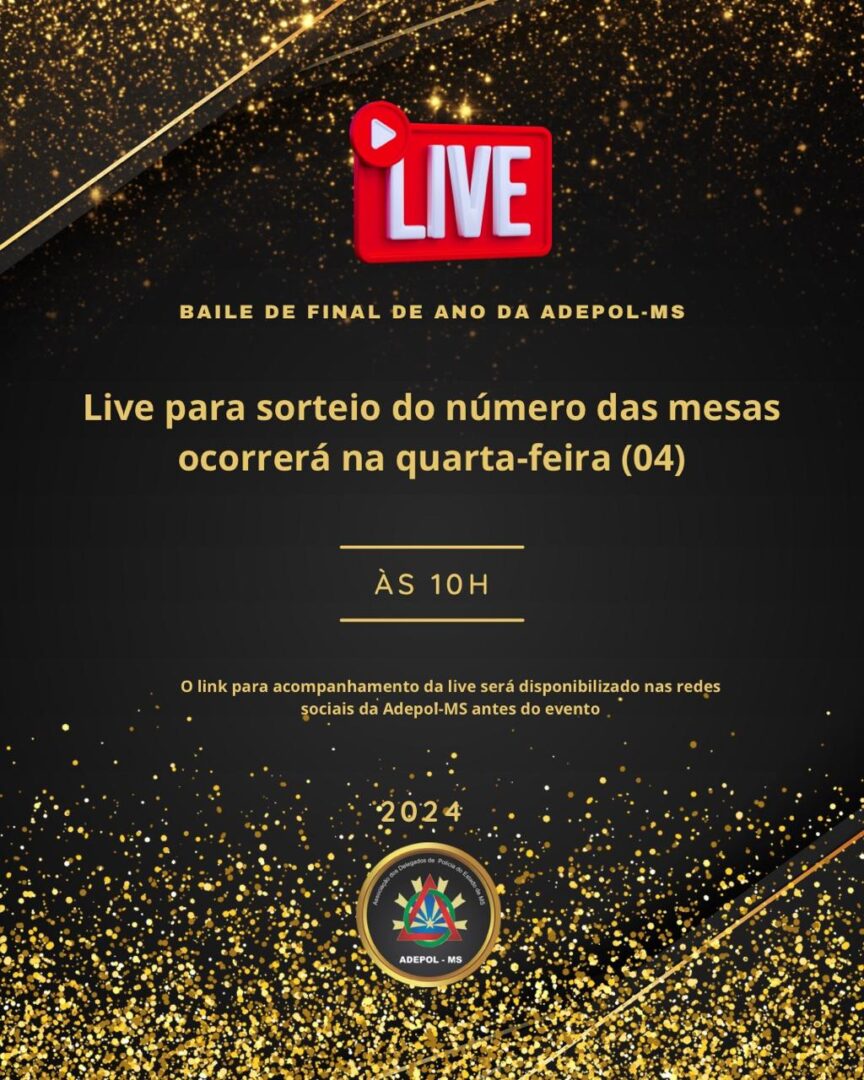 Após o término do período de marcação de presença no Baile de Gala da Adepol/MS, prazo que está sendo de 11/11 até o dia 29/11, na próxima quarta-feira, 04/12, a partir das 10h00, teremos uma live no Youtube em que faremos o sorteio da numeração das mesas.