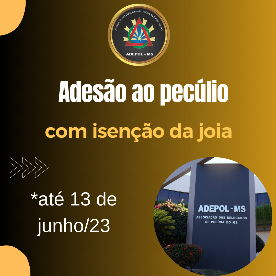 Associados da Adepol-MS têm até o dia 13 de junho para a adesão com desconto ao pecúlio da instituição. Quem fizer a adesão nesse período ficará isento do pagamento da joia, prevista no regulamento.